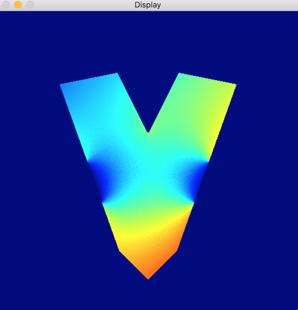 The ultimate goal here is an algorithm which, given the shape of the plate and the temperatures of its walls, finds the steady state temperature inside the plate. In my next blog post, I talk about the Random Walks on Spheres approach, which was used to generate the above image, as well as the below image, wherein the shape of the plate and the boundary temperature distribution are a bit funkier.
